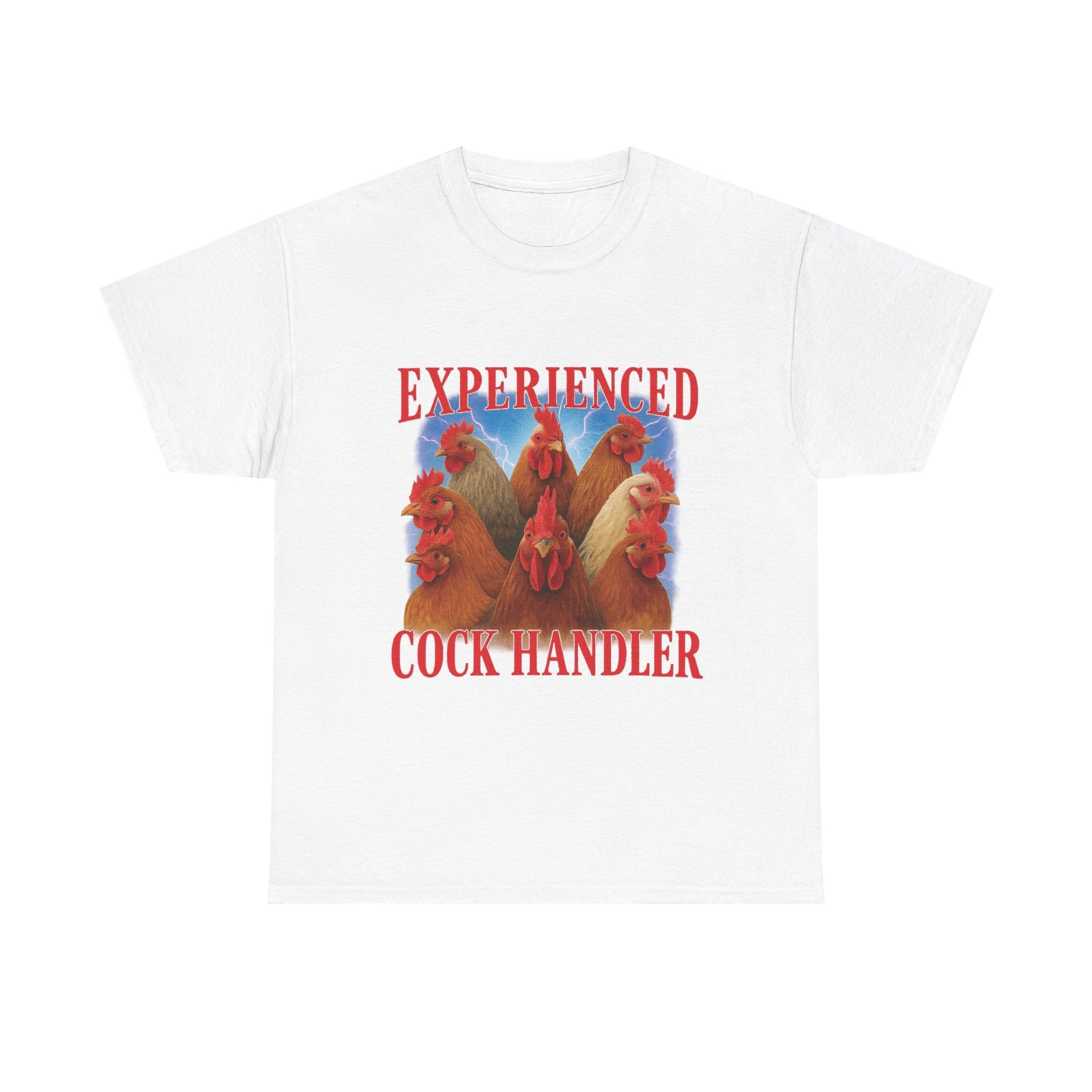 Whether you’ve got a thing for poultry or just enjoy handling life’s… bigger responsibilities, this shirt says it all without saying too much. Covered in proud roosters and crowned with lightning bolts, it’s the ultimate uniform for anyone who knows their way around a cock — barnyard or otherwise.