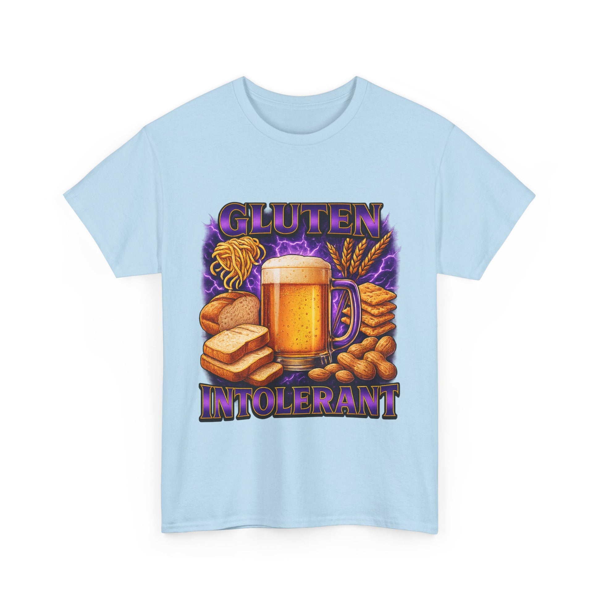Bold, ironic, and packed with everything you can’t eat. The Gluten Intolerant Tee is a full-blown celebration of bread, beer, pasta, crackers, and wheat — all splashed across your chest in over-the-top glory. The giant metallic lettering screams “GLUTEN INTOLERANT,” while lightning and cosmic vibes crank the drama to max.