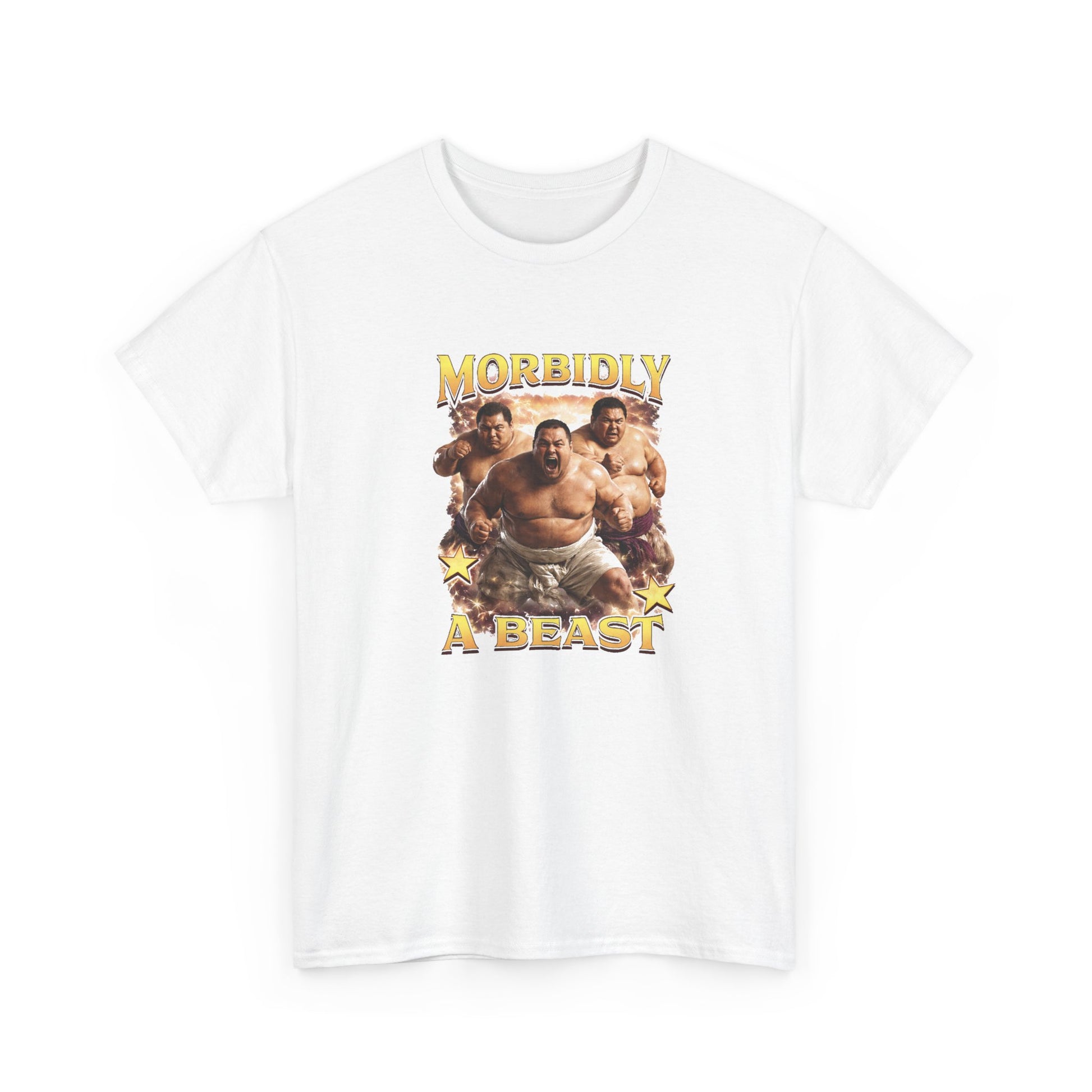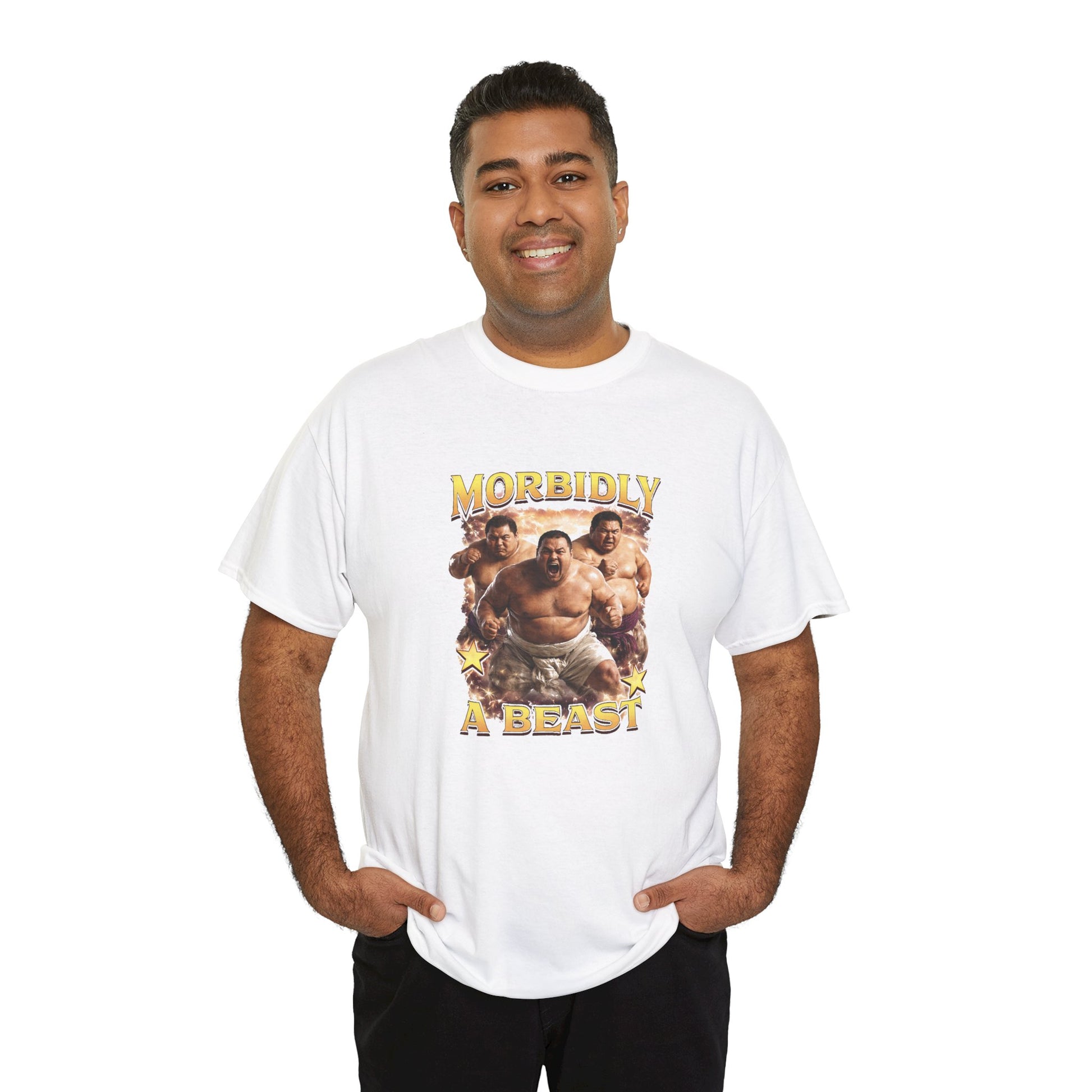 The Morbidly A Beast T-shirt is a bold parody design that celebrates size, confidence, and unapologetic humour.